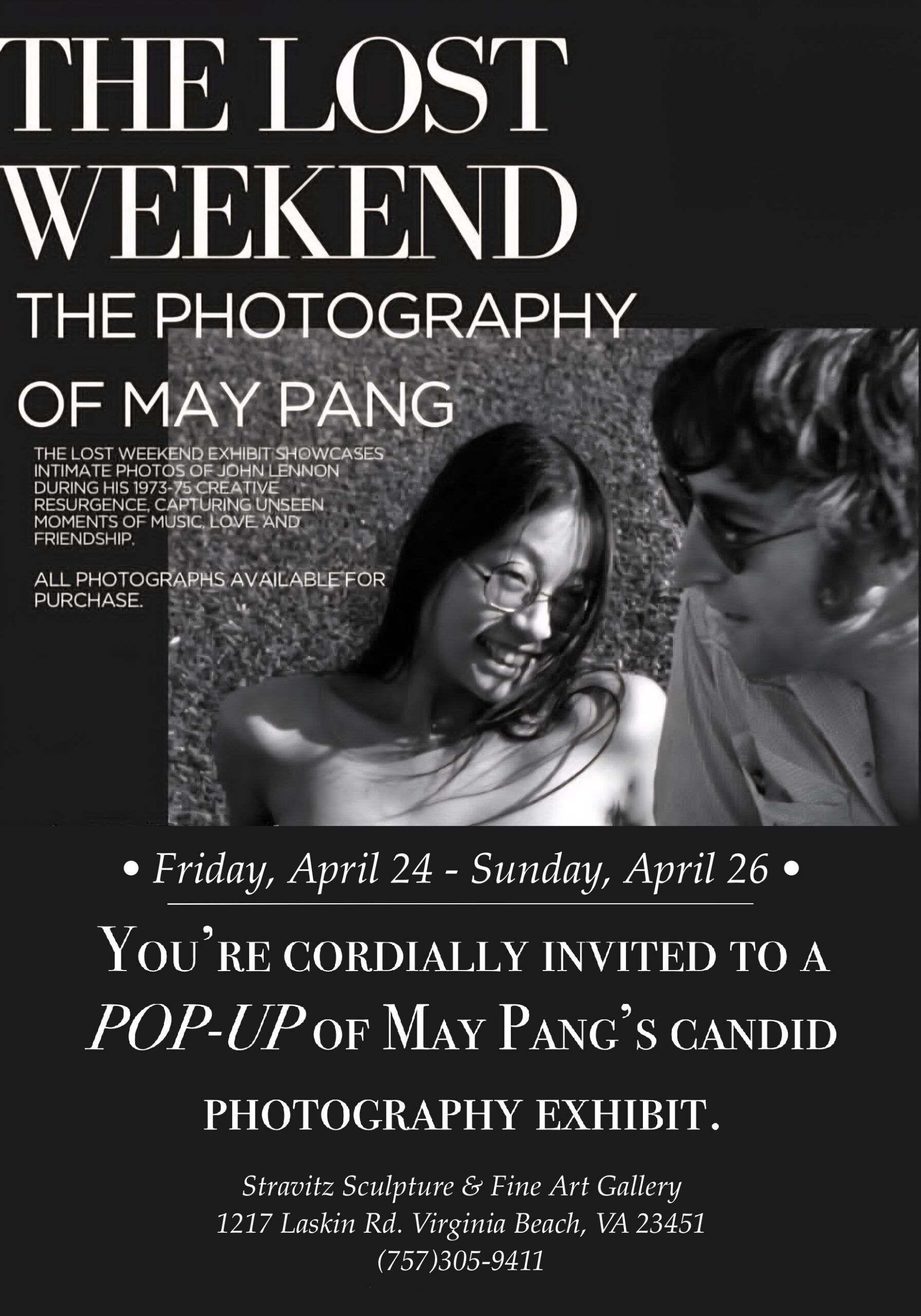 Stravitz Art Gallery 1217 Laskin Rd, Virginia Beach, VA, United StatesMeet photographer May Pang in person and take a peek into her intimate relationship with John Lennon. Her candid photos highlight their 18-month affair referred to as "The […]